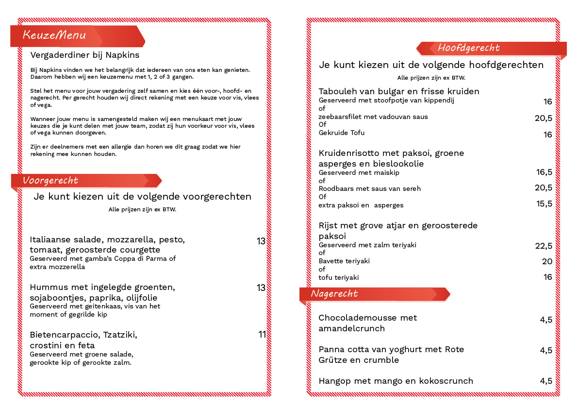 Bij Napkins draait het niet alleen om vergaderen. Wij geloven in de kracht van goed eten. Ons menu is samengesteld met aandacht voor verse, lokale ingrediƫnten die zorgen voor een smaakvolle ervaring. Of je nu kiest voor een uitgebreid diner of een lichter menu, bij ons is het altijd culinair genieten.